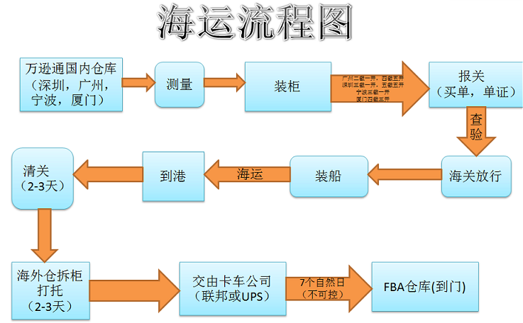 海运+当地清关+派送,船靠岸后并完成清关手续后,柜子提回万逊通海外仓库,在仓库拆柜,并按照亚马逊要求打托盘,快递派送和卡车派送分开处理,卡车派送预约后送入亚马逊各个仓库,适合销量较稳定的产品和中大件产品,可大大降低物流成本。